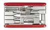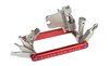 Werkzeug mit 16 Funktionen, Innensechskantschlüsseln 2/ 3/ 4/ 5/ 6/ 8, Rundinnensechskant 25, Phillips 2, Schlitzschraubenzieher, Speichenschlüssel 13/ 14/ 15/ 16G und Mavic Spline, Kettennieter, FlaschenöffnerMaterial: Aluminium, Stahl